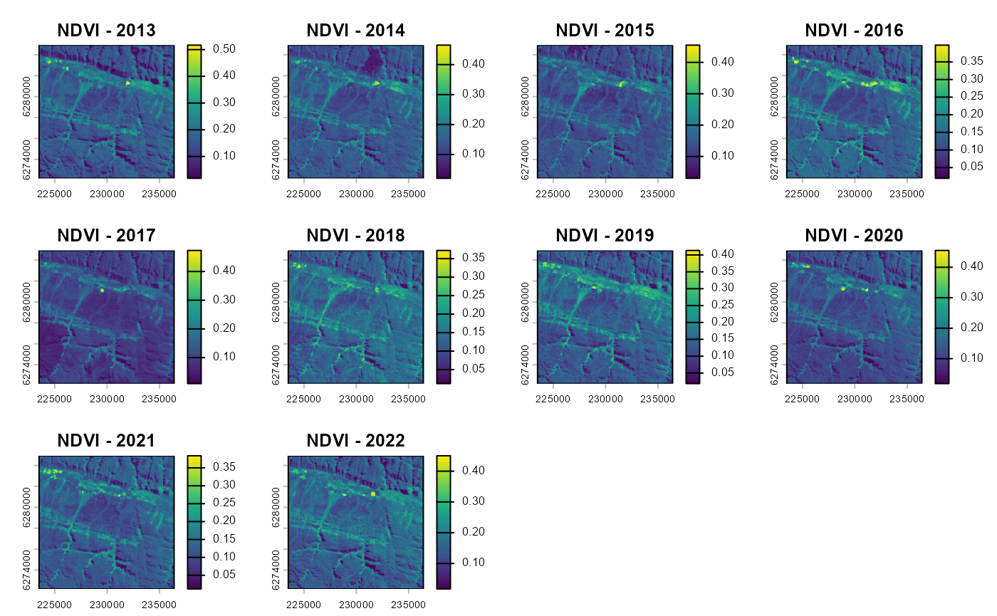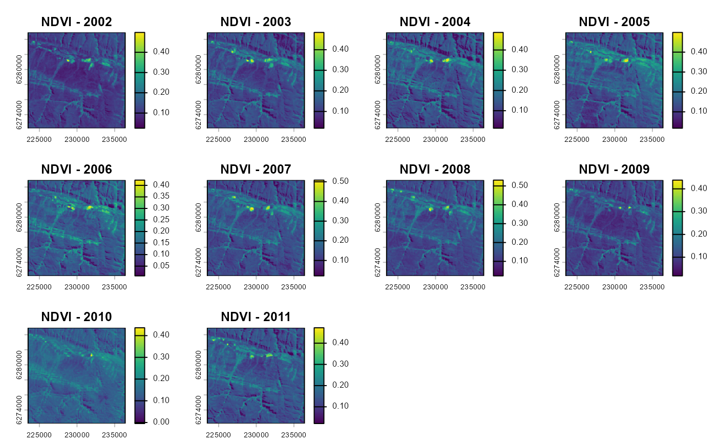 plot(vi_before, main=paste0("NDVI - ",seq(year-10, year-1, 1)))