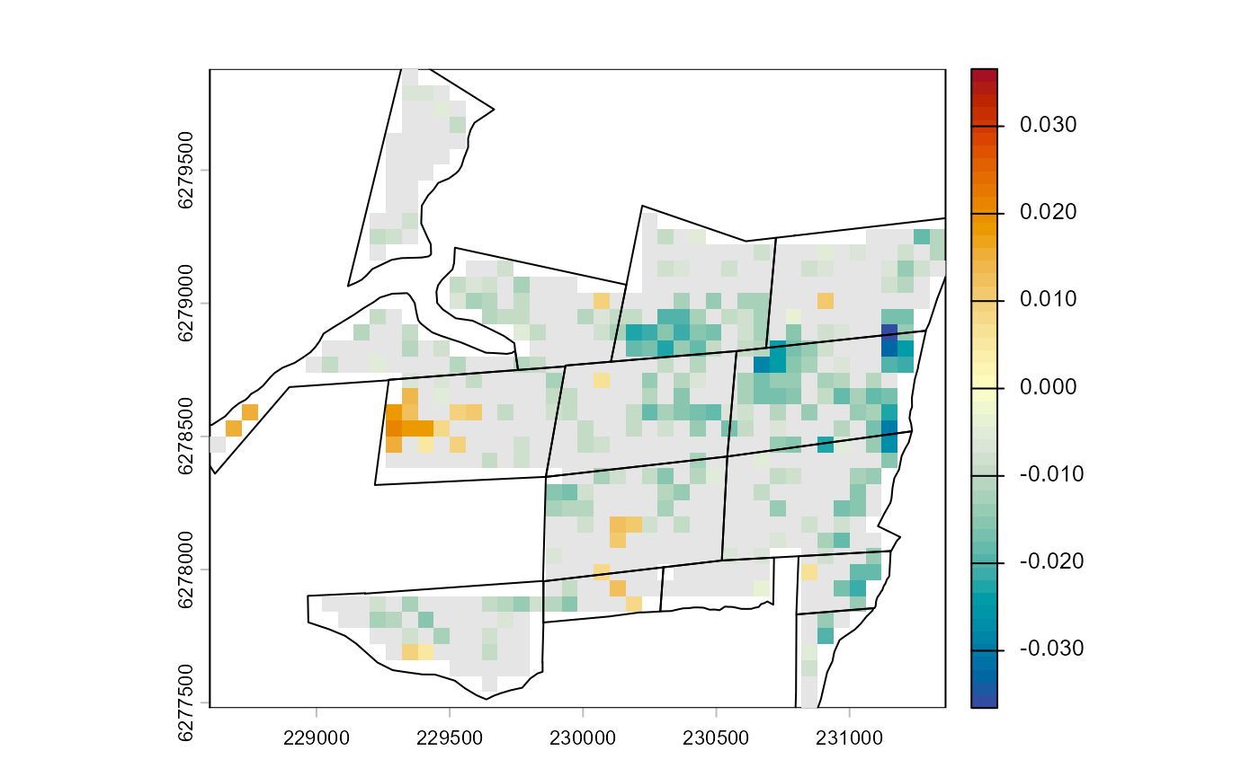 #> 6: 0.02101184The BACI results can also be plotted on a map, here with non-significant BACI contrast masked out. If desired, the pixel-based results can now be aggregated to different spatial levels, e.g., the revegetation site.