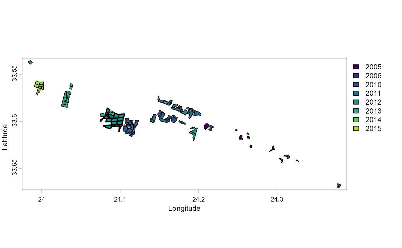 plot(baviaanskloof, "Planting_date", xlab="Longitude", ylab="Latitude")